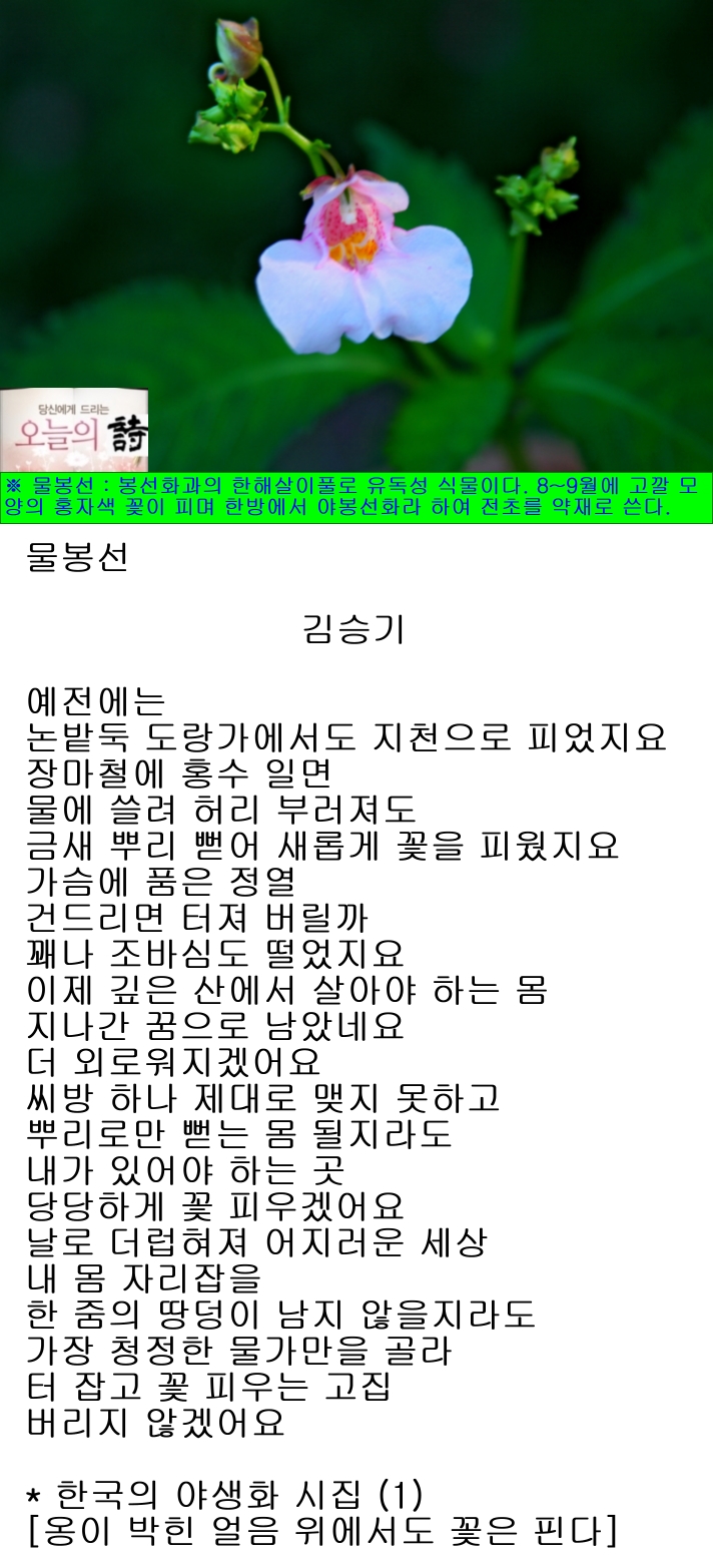 ※ 물봉선 : 봉선화과의 한해살이풀로 유독성 식물이다. 우리나라 각처의 산이나 들의 습지 또는 도랑가와 산골짜기의 냇가에 자생한다. 전체에 털이 없으며, 부드럽고 연하다. 줄기는 물기가 많고, 곧게 서며, 가지가 갈라지고, 매끄러우며, 붉은색을 띤다. 마디가 볼록하게 나오고, 잎은 어긋나는데 계란형 또는 넓은 피침형으로 잎자루가 있고, 끝이 뾰족하며, 가장자리에 톱니가 있다. 8~9월에 고깔 모양의 홍자색 꽃이 피는데 꽃자루가 길며, 좌우 양 꽃잎은 크고, 꽃잎 뒤쪽의 기다란 거(距 : 꿀주머니)는 안쪽으로 말린다. 10~11월에 피침형의 열매가 익으면서 탄력적으로 터져 검은색의 씨가 튀어나간다. 한방에서「야봉선화(野鳳仙花)」라 하여 지상부(地上部)의 전초(全草)를 약재로 쓴다.