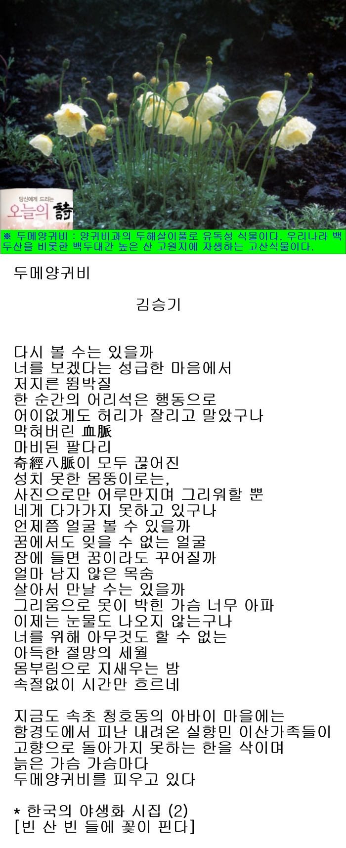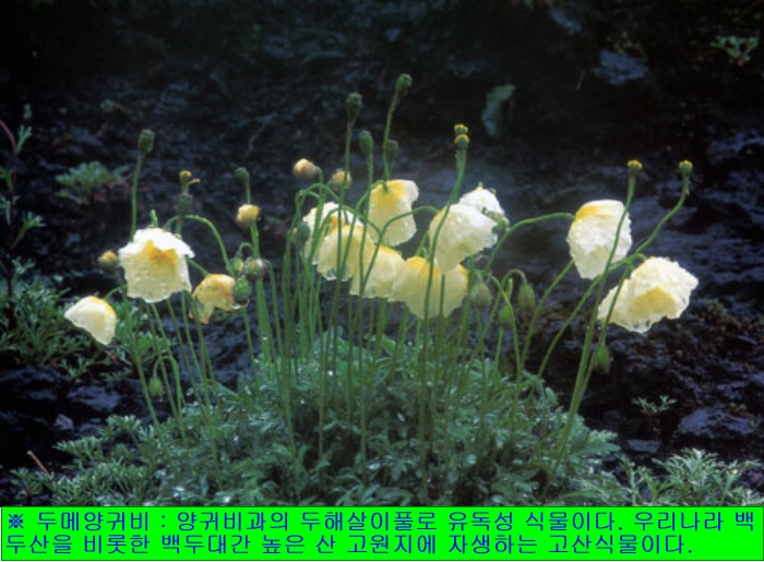 ※ 두메양귀비 : 양귀비과의 두해살이풀로 유독성 식물이다. 우리나라 백두산을 비롯한 함경남북도의 백두대간 높은 산 고원지(高原地)에 자생하는 고산식물이다. 잎은 뿌리에서 뭉쳐나는데 긴 계란형으로 잎자루가 길고, 1~3회 깃꼴로 갈라진다. 6~8월에 노란색 또는 녹황색의 꽃이 피는데 뿌리잎 사이에서 모여 나온 꽃줄기 끝에 한 송이씩 달린다. 10월에 계란형의 열매가 갈색으로 익는다. 남한의 강원도 백두대간에서도 가끔 발견되며, 관상용으로 심고, 요즘은 식물원에서도 볼 수 있다. 양귀비와 비슷하지만 키가 작다. 흰색의 꽃이 피는 것을「흰두메양귀비」라고 한다.
