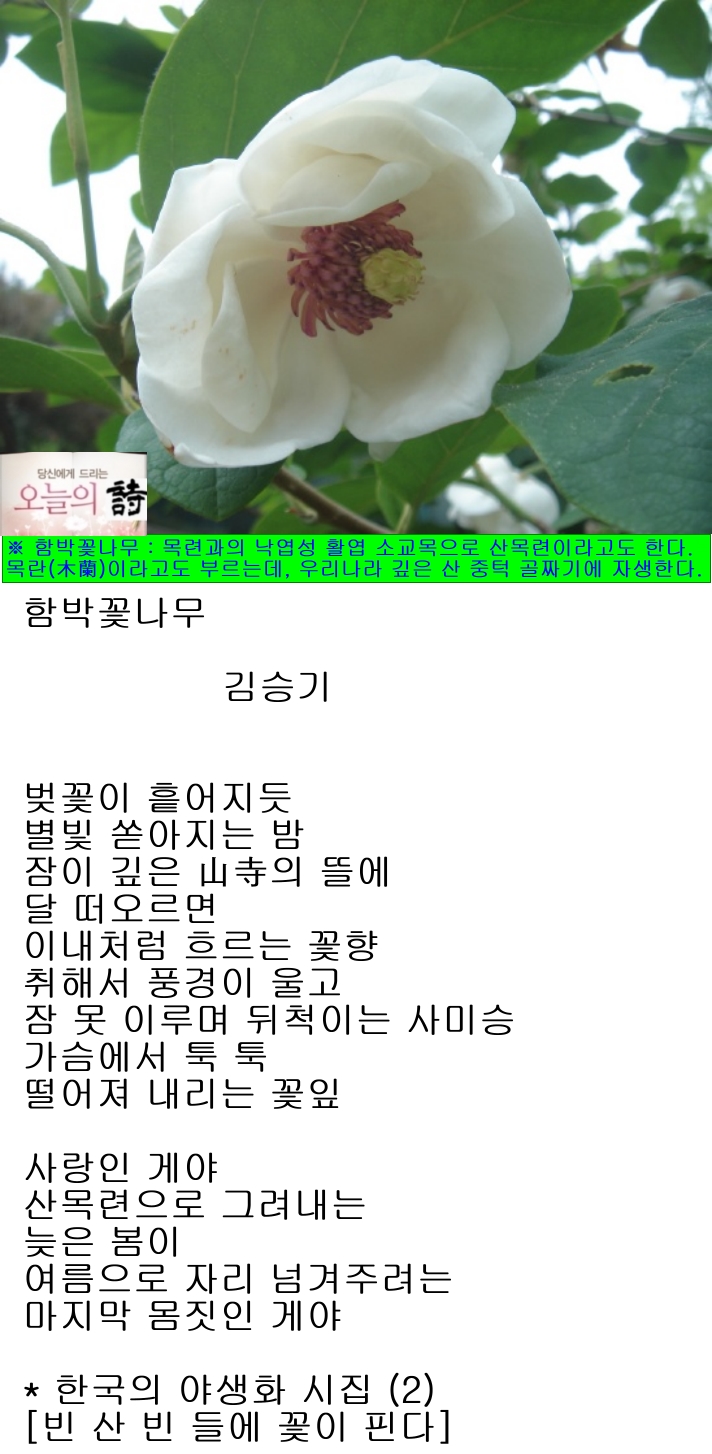 ※ 함박꽃나무 : 목련과의 낙엽성 활엽 소교목으로「산목련」이라고도 한다.「목란(木蘭)」이라고도 부르는데, 우리나라 각처의 깊은 산 중턱 골짜기에 자생한다. 햇가지와 겨울눈에는 털이 있고, 잎은 어긋나는데 계란형으로 끝이 뾰족하며, 가장자리가 밋밋하다. 5~6월에 흰색의 꽃이 잎이 나온 후에 피는데 향기가 있다. 9월에 타원형으로 된 옥수수 모양의 열매가 붉은색으로 익는다. 한방에서「천녀목란(天女木蘭)」이라 하여 꽃봉오리를 약재로 쓴다. 꽃잎이 12개 이상인 것을「겹함박꽃나무」라고 한다.