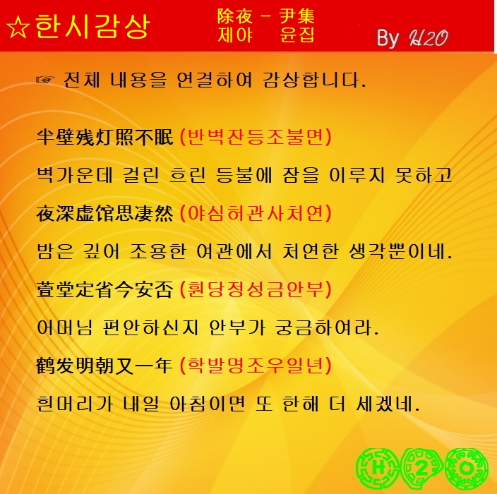 | 한시(漢詩)로 배우는 漢文과 중국어 - 1618 ★除夜 - 尹集 - 1 (0) | 2025.12.29 |