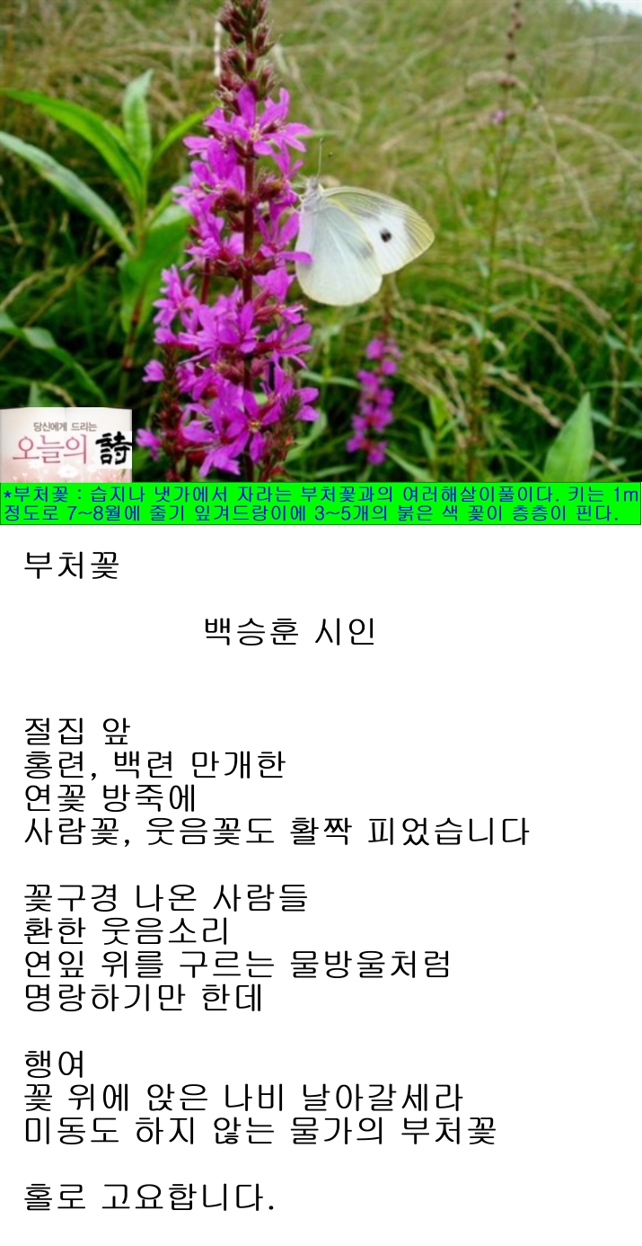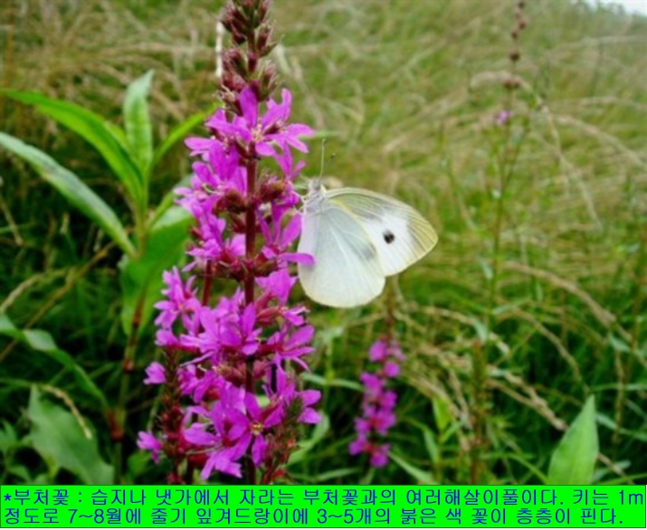 *부처꽃 : 습지나 냇가에서 자라는 부처꽃과의 여러해살이풀이다. 키는 1m 정도로