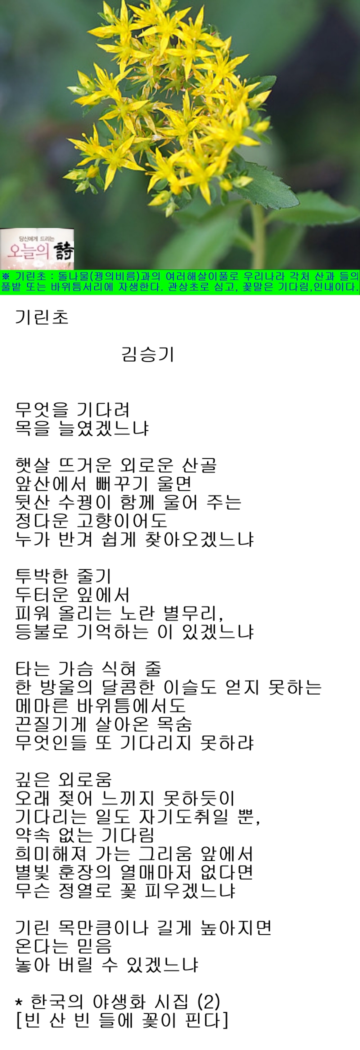 ※ 기린초 : 돌나물(꿩의비름)과의 여러해살이풀로 우리나라 각처 산과 들의 풀밭 또는 바위틈서리에 자생한다. 굵은 뿌리에서 여러 개의 줄기가 모여난다. 잎은 어긋나는데 거꾸로 된 계란형 또는 넓은 피침형으로 잎자루가 없고, 가죽질이며, 끝이 둥글고, 가장자리에 둔한 톱니가 있다. 6~7월에 노란색의 꽃이 별 모양으로 피고, 8~9월에 별 모양의 열매가 검은 갈색으로 익는다. 어린잎은 식용하고, 한방에서「비채(費菜)」라 하여 지상부(地上部)의 전초(全草)를 약재로 쓴다. 잎이 다육질로 되어 있어 비가 오지 않아도 잘 견디며, 메마른 바위에 뿌리를 내리고 자랄 정도로 생명력이 강인하고 번식력도 왕성하다. 관상초로 매우 적합하며, 꽃말은 「기다림」,「인내」이다.