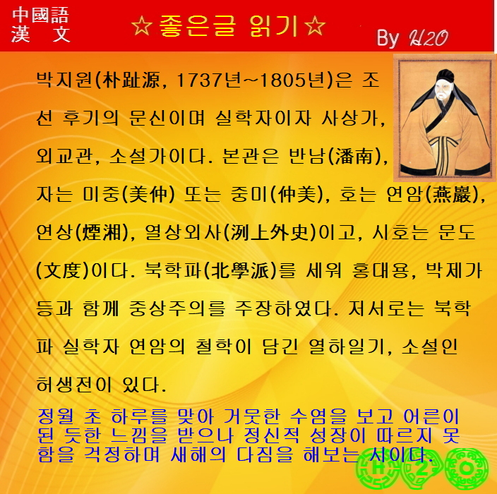 | 한시(漢詩)로 배우는 漢文과 중국어 - 1643 ★元朝對鏡 - 朴趾源 - 2 (1) | 2026.02.17 |