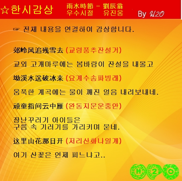 우수가 되면 봄바람이 잔설을 녹이고 따뜻해진 봄물은 얼음장을 녹인다. 봄이 왔다고는 하지만 봄의 상징인 꽃은 아직 보이지 않으니 순진한 아이들이 북쪽으로 날아가는 기러기에 봄꽃이 언제 피느냐고 물어본다. 이상은 이 시의 표면적 의미다. 작가론적 관점에서 좀 더 심층적으로 시를 음미하면 또 다른 시가 된다. 즉, 유진옹은 자호가 須溪居士(수계거사)로, 제자들은 그를 須溪先生(수계선생)이라고 불렀으며, 남송 말의 애국 시인이었다.
