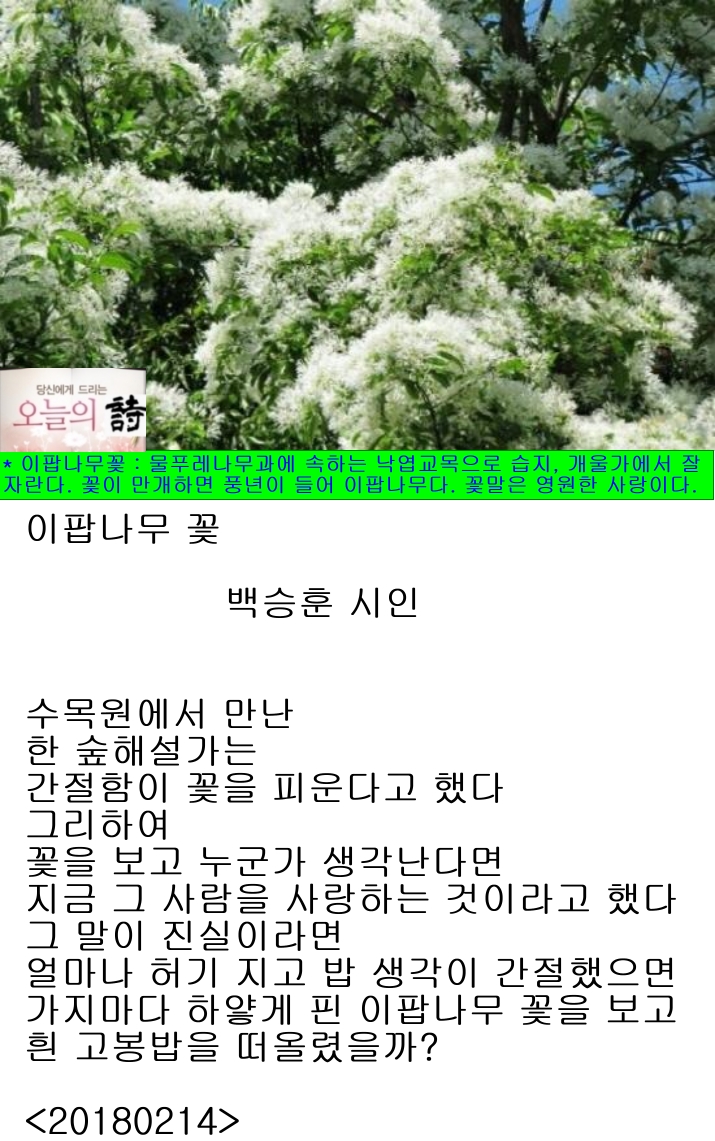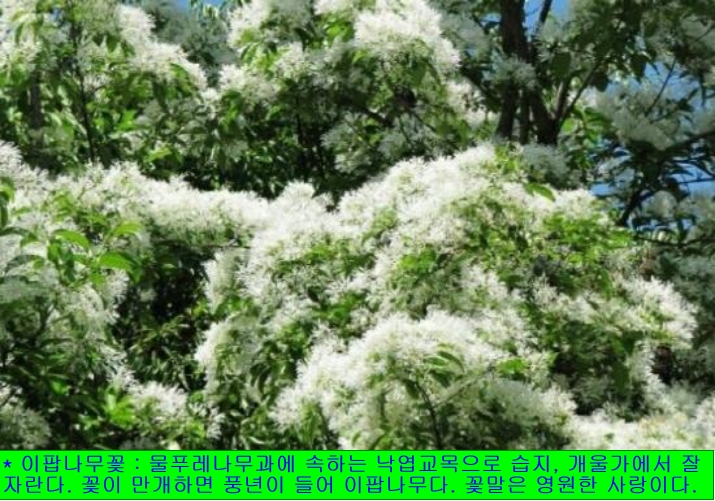 * 이팝나무꽃 : 물푸레나무과에 속하는 낙엽교목으로 산골짜기나 습지, 개울가에서 잘 자라고