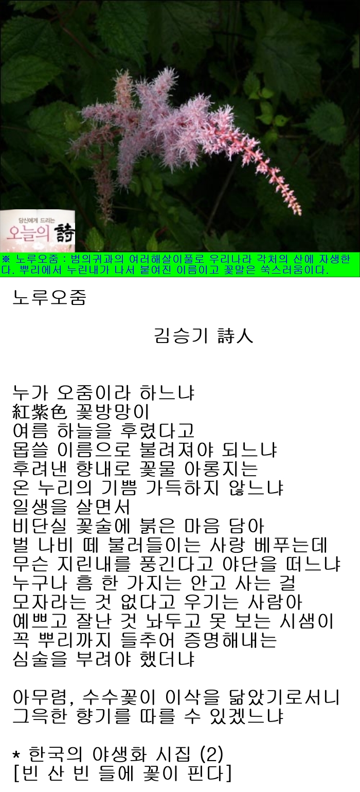 ※ 노루오줌 : 범의귀과의 여러해살이풀로 우리나라 각처의 산에 자생한다. 줄기는 곧게 서고, 갈색의 긴 털이 있다. 잎은 어긋나는데 3출엽으로 잎자루가 길고, 전체가 삼각형 모양이며, 작은잎은 긴 계란형 또는 긴 타원형으로 끝이 날카롭게 뾰족하고, 가장자리에 톱니가 있다. 7~8월에 분홍색 도는 홍자색의 꽃이 줄기 끝에 다닥다닥 모여 피고, 9~10월에 열매가 갈색으로 익는다. 어린순은 식용하고, 한방에서「낙신부(落新婦)」라 하여 뿌리와 지상부(地上部)의 전초(全草)를 약재로 쓴다.「노루오줌」이라는 이름은, 이 풀의 뿌리에서 누린내가 나기 때문에 붙여진 이름이다.