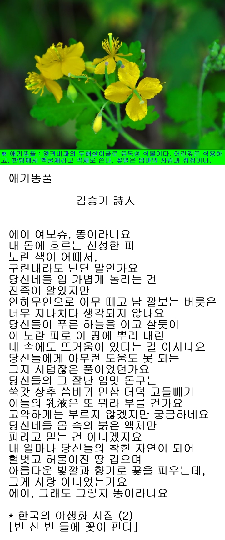 ※ 애기똥풀 : 양귀비과의 두해살이풀로 유독성 식물이다. 우리나라 각처 마을 부근의 양지와 숲 가장자리에 흔하게 자생한다. 줄기는 곧게 서고 가지를 치며 잎과 더불어 흰색을 띤다. 어릴 때는 흰색의 곱슬곱슬한 털이 많이 있으나 자라면서 없어진다. 잎은 어긋나는데 잎자루가 있고, 새의 깃 모양으로 한두 차례 깊게 갈라진다. 갈래는 긴 타원형으로 가장자리에 둔한 톱니가 있다. 5~8월에 노란색의 꽃이 피고, 9월에 기다란 기둥 모양의 열매가 갈색으로 익는데 검은 씨가 들어 있다. 어린잎은 식용하고, 한방에서「백굴채(白屈菜)」라 하여 지상부(地上部)의 전초(全草)를 약재로 쓴다. 줄기를 자르면 노란색의 즙액이 나오는데 아기의 똥 같아서 이름이 붙여졌다. 즙액에는 독이 있으므로 먹지 않도록 조심해야 한다.