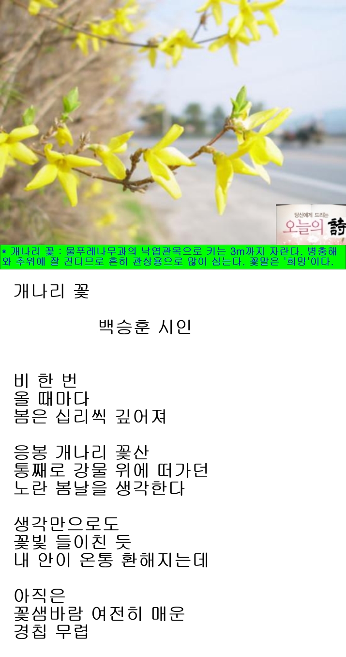* 개나리 꽃 : 물푸레나무과의 낙엽관목으로 키는 3m까지 자란다. 4월에 잎겨드랑이에서