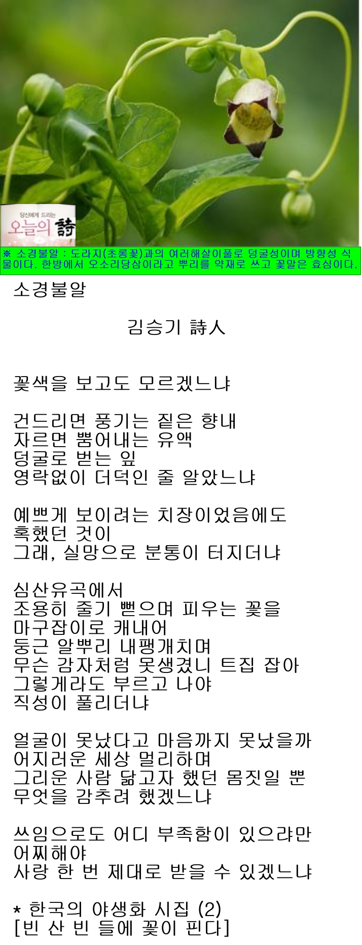 ※ 소경불알 : 도라지(초롱꽃)과의 여러해살이풀로 덩굴성이며 방향성 식물이다. 우리나라 각처의 산지 숲속에서 자생한다. 전체에 털이 있고, 덩이뿌리는 둥글다. 줄기를 자르면 하얀 유액(乳液)이 나오고, 잎은 어긋나는데 겉가지에서 비대칭의 4출엽으로 나온다. 작은잎은 계란형 또는 타원형으로 앞면은 녹색이고, 뒷면은 분백색이며, 가장자리는 밋밋하다. 7~9월에 꽃 전체가 자주색 또는 꽃의 화관 끝 꽃부리 갈래가 자주색인 꽃이 짧은 가지 끝에서 종 모양으로 아래를 향하여 피고, 10~11월에 원추형의 열매가 갈색으로 익는데 까만 씨가 들어있다. 뿌리는 식용하고, 한방에서「오소리당삼(烏蘇里黨蔘)」이라 하여 뿌리를 약재로 쓴다.「더덕」과 혼동하기 쉬우나,「더덕」은 덩이뿌리가「도라지」모양이고 4장의 작은잎이 대칭이며 꽃의 겉은 연록색이고 꽃부리의 갈래 안쪽이 자주색이면서 화관 안쪽에 짙은 갈색의 반점이 있지만,「소경불알」은 덩이뿌리가 둥글고, 4장의 작은 잎이 비대칭이며 꽃의 전체가 자주색이거나 또는 꽃의 겉이 연록색이면서 꽃부리의 갈래 안쪽이 자주색이나 화관 안쪽에 반점이 없는 점이 다르다. 뿌리가 감자처럼 둥글고 못 생겼기에 이런 이름이 붙여졌다 한다.『야생화에게 아름답고 고운 이름 지어주기 운동』의 일환으로 붙여진 새로운 이름을「까치더덕」이라고 하는데, 아직 널리 통용되지 못하고 있을 뿐 아니라 식물도감에도 수록되지 못하고 있어 안타깝기만 하다.