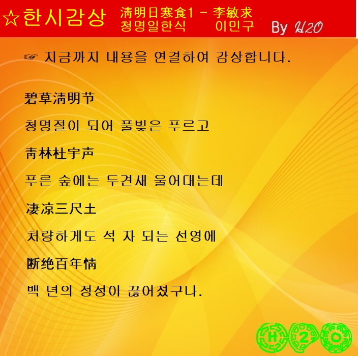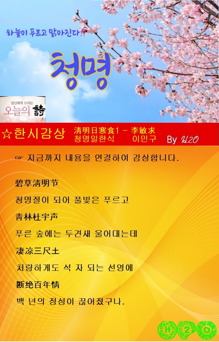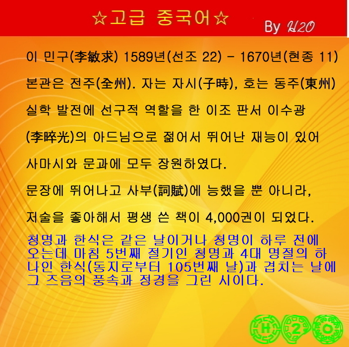 | 한시(漢詩)로 배우는 漢文과 중국어 - 1667 ★淸明日寒食 - 李敏求 - 1 (2) | 2026.04.02 |