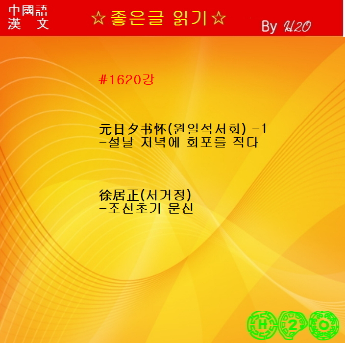 한시(漢詩)로 배우는 漢文과 중국어 - 1620 ★元日夕書懷 - 徐居正 - 1 #1620강 한시(漢詩)로 배우는 漢文과 중국어 ★元日夕書懷 - 徐居正 - 1 한시나 사서삼경등 한문의 명문장을 감상합니다.중국어와 한문, 한자를 익히며 한시를 즐겨보세요.좋은 글을 한문으로 읽어 마음과 정신의 풍요로움을.... 이 시는 새해 첫날을 맞아 정경과 자신의 느낌을 그린 시입니다. 내용:兒童閑事喜新年 (아동한사희신년)歡笑團圝聒我眠 (환소단란괄아면) 아이들은 쓸데없이 새해를 좋아하여모여서 웃고 떠들어 나를 못 자게 하네. 고급 중국어 강좌 10:15:18