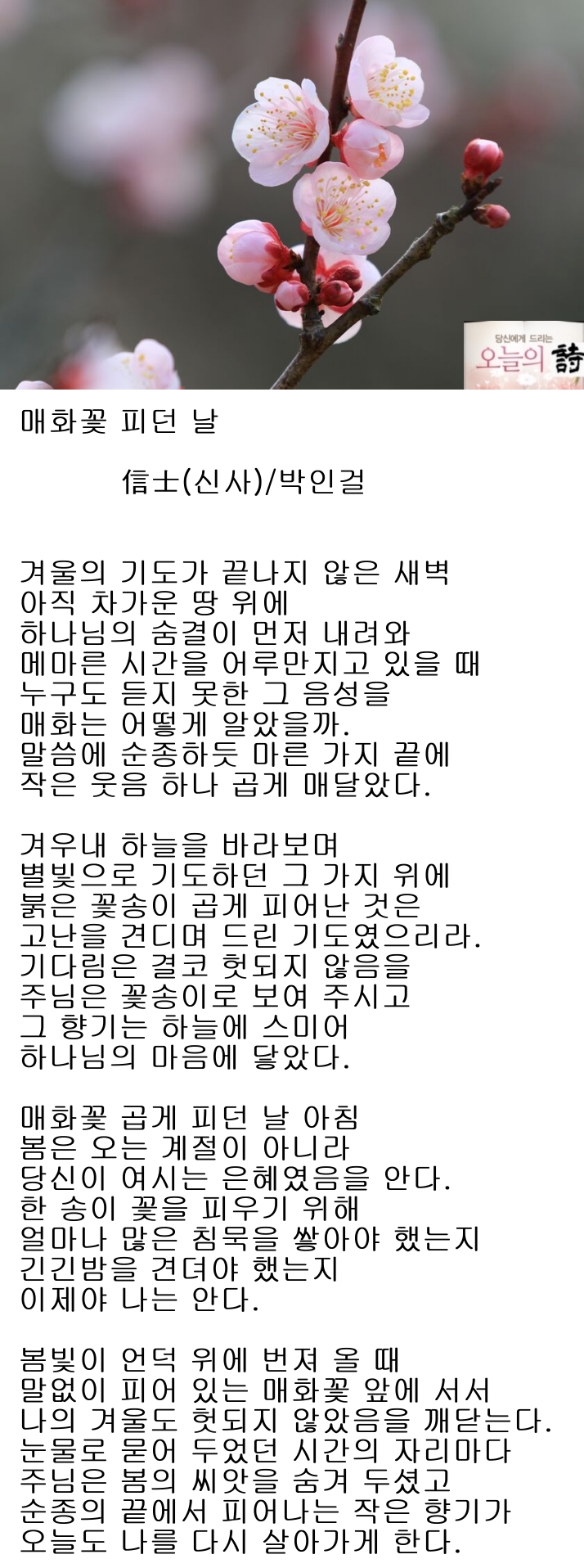 매화꽃 피던 날 - 信士(신사) 박인걸 겨울의 기도가 끝나지 않은 새벽 아직 차가운 땅 위에 하나님의 숨결이 먼저 내려와 메마른 시간을 어루만지고 있을 때 누구도 듣지 못한 그 음성을 매화는 어떻게 알았을까. 말씀에 순종하듯 마른 가지 끝에 작은 웃음 하나 곱게 매달았다. 겨우내 하늘을 바라보며 별빛으로 기도하던 그 가지 위에 붉은 꽃송이 곱게 피어난 것은 고난을 견디며 드린 기도였으리라. 기다림은 결코 헛되지 않음을 주님은 꽃송이로 보여 주시고 그 향기는 하늘에 스미어 하나님의 마음에 닿았다. 매화꽃 곱게 피던 날 아침 봄은 오는 계절이 아니라 당신이 여시는 은혜였음을 안다. 한 송이 꽃을 피우기 위해 얼마나 많은 침묵을 쌓아야 했는지 긴긴밤을 견뎌야 했는지 이제야 나는 안다. 봄빛이 언덕 위에 번져 ..