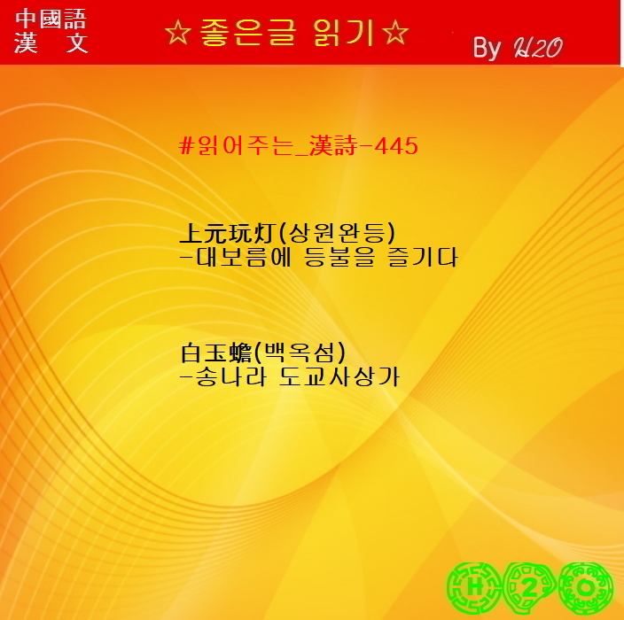 #읽어주는_漢詩-445 ★上元玩燈 - 白玉蟾 #읽어주는_漢詩-445 ☆한시감상 ★上元玩燈 - 白玉蟾 碧玉融成萬里天 (벽옥융성만리천)滿城羅綺競春妍 (만성라기경춘연)벽옥이 무르녹아 만 리 하늘 이루었고온 성안 비단 옷들 봄 어여쁨 다투네. 柳梢掛月黃昏後 (류초괘월황혼후)夜市張燈白晝然 (야시장등백주연)황혼 뒤 버들 끝엔 달님이 걸려 있고야시장에 펼친 등불 대낮처럼 환하네. 대보름날 밤의 색채감을 찬란하게 묘사했다. 첫째 구(起句)는 밤하늘 벽옥색이다. 둘째 구(承句)는 온갖 비단 옷의 현란한 색깔이다. 셋째 구(轉句)는 황혼 뒤 버드나무 끝에 떠오른 보름달의 황금색이다. 넷째 구(結句)는 대보름을 즐기기 위해 야시장에 환하게 켜놓은 등불의 붉은 색이다. 중국에서는 대보름을 등절(燈節)이라고도 부르므로 이날 밤은 그야말로 채색 페스티벌이다.송나라 신기질(.. 고급 중국어 강좌 2026.03.04