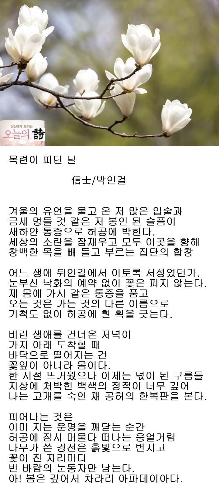 목련이 피던 날 - 信士 박인걸 겨울의 유언을 물고 온 저 많은 입술과 금세 멍들 것 같은 저 봉인 된 슬픔이 새하얀 통증으로 허공에 박힌다. 세상의 소란을 잠재우고 모두 이곳을 향해 창백한 목을 빼 들고 부르는 집단의 합창 어느 생애 뒤안길에서 이토록 서성였던가. 눈부신 낙화의 예약 없이 꽃은 피지 않는다. 제 몸에 가시 같은 통증을 품고 오는 것은 가는 것의 다른 이름으로 기척도 없이 허공에 흰 획을 긋는다. 비린 생애를 건너온 저녁이 가지 아래 도착할 때 바닥으로 떨어지는 건 꽃잎이 아니라 몸이다. 한 시절 뜨거웠으나 이제는 넋이 된 구름들 지상에 처박힌 백색의 정적이 너무 깊어 나는 고개를 숙인 채 공허의 한복판을 본다. 피어나는 것은 이미 지는 운명을 깨닫는 순간 허공에 잠시 머물다 떠나는 응..