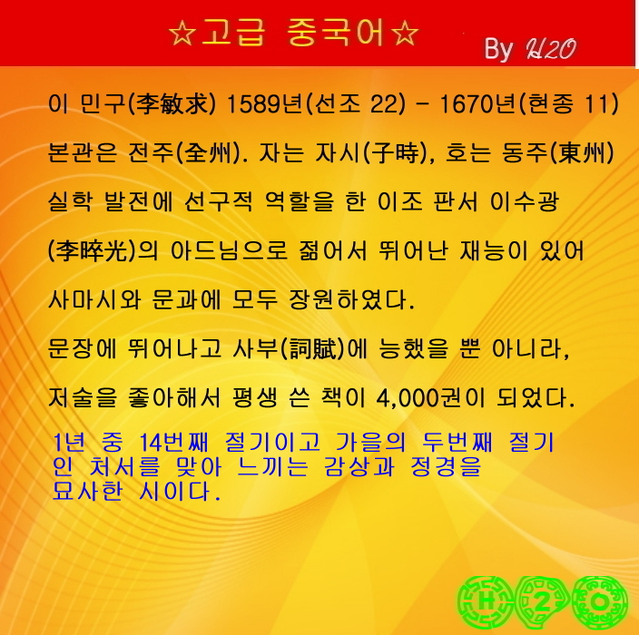 #1548한시(漢詩)로 배우는 漢文과 중국어 ★處暑日 - 李敏求 - 2
