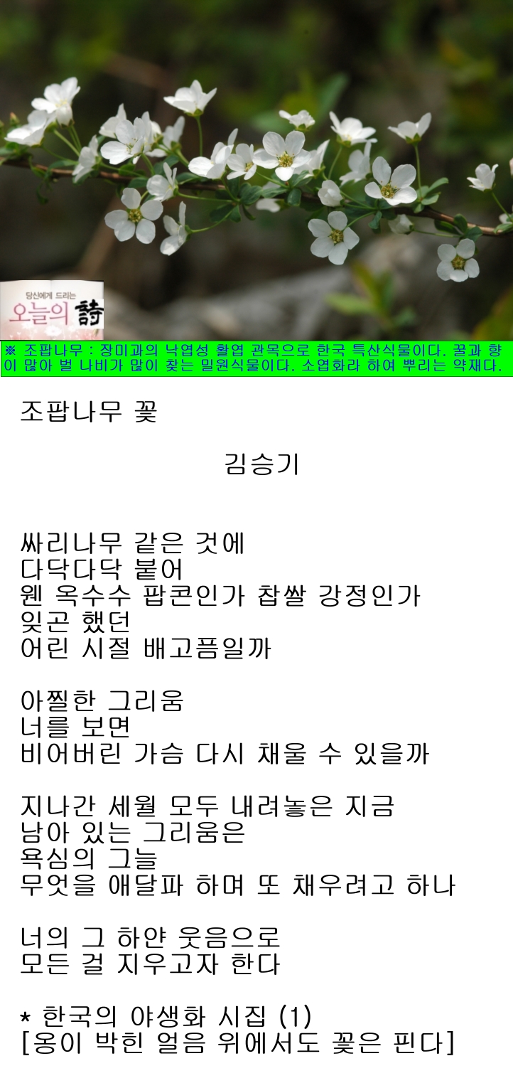 ※ 조팝나무 : 장미과의 낙엽성 활엽 관목으로 한국 특산식물이다. 우리나라 각처의 들과 산기슭 양지나 논밭 둑에 자생한다. 줄기는 무더기로 모여나며, 잎은 어긋나는데 계란형 또는 타원형으로 끝이 뾰족하고, 가장자리에 톱니가 있으며, 양면에 털이 없다. 4~5월에 흰색의 꽃이 잎보다 먼저 피고, 5~9월에 열매가 황갈색으로 익는다. 어린잎은 식용하고, 한방에서「소엽화(笑靨花)」라 하여 뿌리를 약재로 쓴다. 꿀과 향이 많아 벌 나비가 많이 찾는 밀원식물이다. 겹꽃이 피는 것을「겹조팝나무」라고 한다.