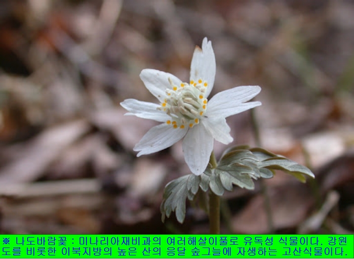 ※ 나도바람꽃 : 미나리아재비과의 여러해살이풀로 유독성 식물이다. 우리나라 강원도를 비롯한 이북지방의 백두대간 높은 산의 응달진 숲그늘에 자생하는 고산식물이다. 뿌리줄기는 짧고, 줄기는 곧게 선다. 잎은 줄기 중앙에 한 장이 달리는데 3장의 작은 잎으로 된 겹잎으로 잎자루가 길다. 작은잎도 잎자루가 있으며, 다시 3갈래로 깊게 갈라지고, 갈래에 결각상으로 된 톱니가 있다. 4~6월에 흰색의 꽃이 피는데 꽃줄기 끝의 잎 모양으로 생긴 총포 위에 모여 달린다. 7~9월에 타원형의 열매가 별처럼 갈라진 모양으로 익는다.
