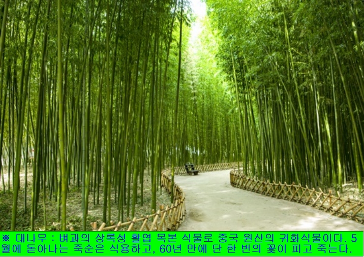 ※ 대나무 : 벼과의 상록성 활엽 목본 식물로 중국 원산의 귀화식물이다. 우리나라 남부지방의 집 근처에 재배하거나 또는 울타리로 심는다. 줄기는 녹색에서 황록색으로 변하고, 나무의 속이 텅 비어 있으며, 마디가 있어 마디마다 얇은 종잇장 같은 막으로 형성되어 있다. 잎은 넓은 피침형으로 가지 끝에 모여 달린다. 6~7월에 황록색의 꽃이 피고, 10~11월에 열매가 익는다. 5월에 돋아나는 죽순은 식용하고, 줄기는 죽세공품으로 이용하며, 한방에서 어린 순을「죽순(竹筍)」이라 하고, 잎을「죽엽(竹葉))」이라 하며, 진액을「죽력(竹瀝)」이라 하고, 겉껍질을 벗긴 후의 섬유질(속껍질)을「죽여(竹茹)」라 하며, 열매를「죽실(竹實)」이라 하여 약재로 쓴다. 일생을 통하여 60년 만에 단 한 번의 꽃이 피며, 꽃이 핀 다음에는 죽는 식물이다.
