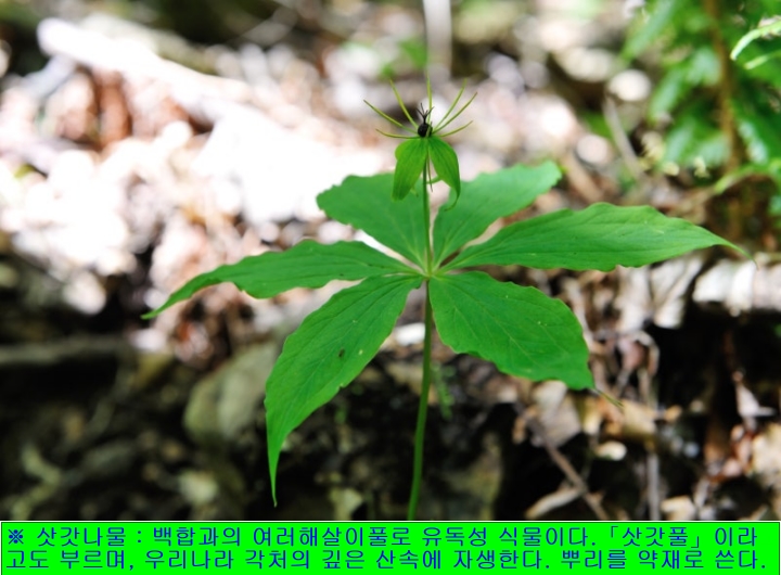 ※ 삿갓나물 : 백합과의 여러해살이풀로 유독성 식물이다.「삿갓풀」이라고도 부르며, 우리나라 각처의 깊은 산속에 자생한다. 땅속줄기는 길고 땅위줄기는 곧게 선다. 잎은 돌려나는데 넓은 피침형 또는 좁고 긴 타원형으로 양끝이 뾰족하다. 5~7월에 황록색 또는 진황색의 꽃이 돌려나는 잎의 중앙에서 나온 꽃줄기 끝에 한 송이씩 위를 향해 핀다. 8~10월에 둥근 모양의 열매가 검은 자주색으로 익는다. 어린순을 식용하며, 한방에서「조휴(蚤休)」라 하여 뿌리줄기를 약재로 쓴다.