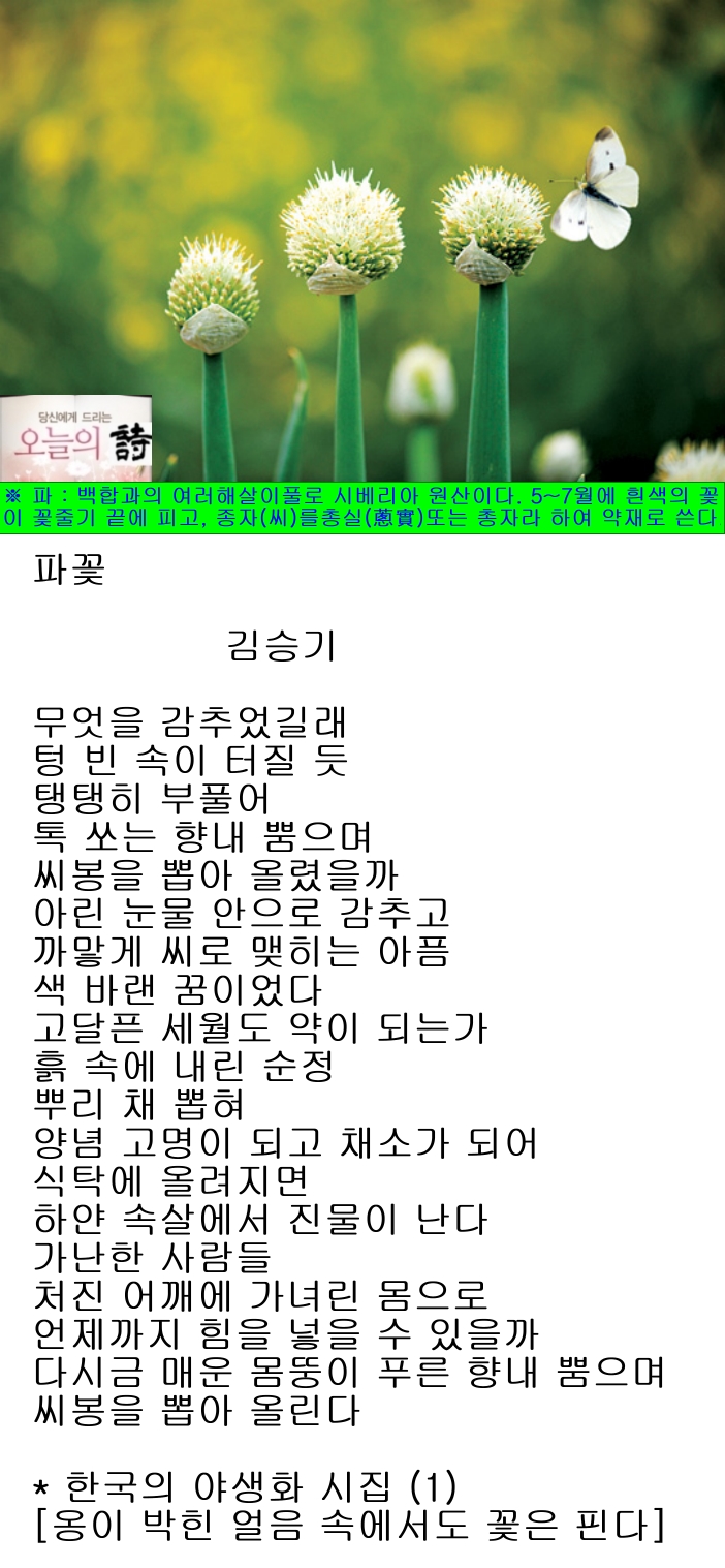 ※ 파 : 백합과의 여러해살이풀로 시베리아 원산이다. 우리나라 각처의 농가 밭에서 재배하는 작물이다. 비늘줄기는 그리 굵지 않고 수염뿌리가 많다. 잎은 두 줄로 배열하고 통으로 된 기둥 모양으로 끝이 뾰족하며, 밑이 엽초로 되고, 녹색 바탕에 흰빛이 돌고, 끈적인다. 5~7월에 흰색의 꽃이 원기둥 모양의 꽃줄기 끝에 둥글게 모여 피고, 7~8월에 열매가 익으면서 껍질이 벌어져 검은색의 씨가 드러난다. 우리의 중요한 채소의 하나로 비늘줄기와 잎을 식용하는데 나물로 먹기도 하고, 김치를 담그기도 하며, 다져서 양념으로 쓰기도 한다. 한방에서 비늘줄기를「총백(蔥白)」이라 하고, 종자(씨)를「총실(蔥實)」또는「총자(葱子)」라 하여 약재로 쓴다.