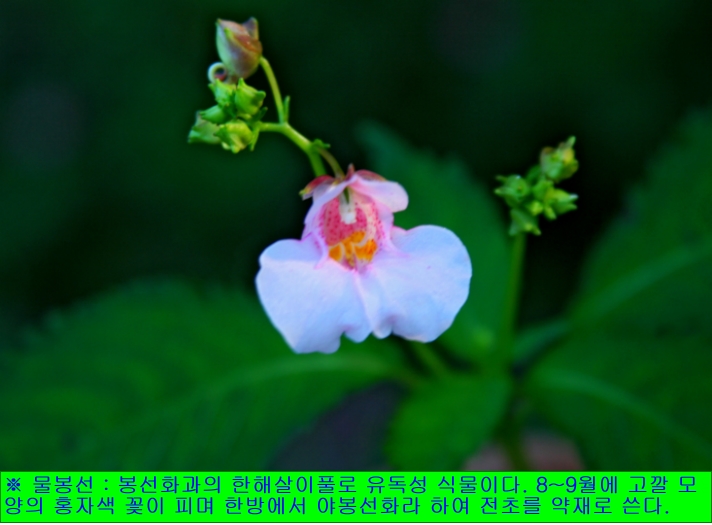 ※ 물봉선 : 봉선화과의 한해살이풀로 유독성 식물이다. 우리나라 각처의 산이나 들의 습지 또는 도랑가와 산골짜기의 냇가에 자생한다. 전체에 털이 없으며, 부드럽고 연하다. 줄기는 물기가 많고, 곧게 서며, 가지가 갈라지고, 매끄러우며, 붉은색을 띤다. 마디가 볼록하게 나오고, 잎은 어긋나는데 계란형 또는 넓은 피침형으로 잎자루가 있고, 끝이 뾰족하며, 가장자리에 톱니가 있다. 8~9월에 고깔 모양의 홍자색 꽃이 피는데 꽃자루가 길며, 좌우 양 꽃잎은 크고, 꽃잎 뒤쪽의 기다란 거(距 : 꿀주머니)는 안쪽으로 말린다. 10~11월에 피침형의 열매가 익으면서 탄력적으로 터져 검은색의 씨가 튀어나간다. 한방에서「야봉선화(野鳳仙花)」라 하여 지상부(地上部)의 전초(全草)를 약재로 쓴다.